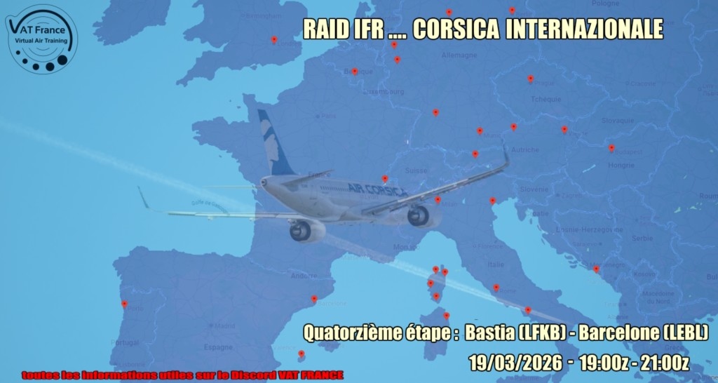 VATFrance organise des Raids IFR et des vols VFR en réseau que je relaie ici .( Le vol sera effectué connecté en ligne au réseau ATC VATSIM ou IVAO : on choisit le réseau le soir du vol en fonction de la couverture de controle )