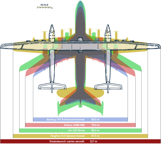 Première sortie (1-6-2017 ) pour l'avion géant Stratolaunch. Financé par Paul Allen, le cofondateur de Microsoft, cet énorme avion a une envergure de 117 mètres de large et 72 mètres de long. Perché sur 28 roues et propulsé par six réacteurs, l'appareil doit transporter et lancer en orbite basse une fusée et son satellite. Le premier vol d'essai est prévu pour 2019.